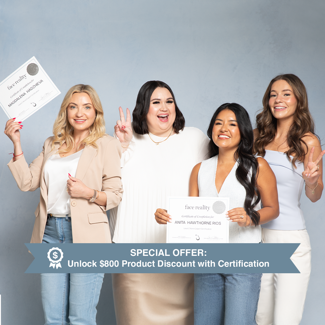 When you enroll in The Face Reality Acne Professional Program™, your certification training pays for itself. Invest in training for $800 and after you complete your certification, you’ll receive $800 off your opening order*.