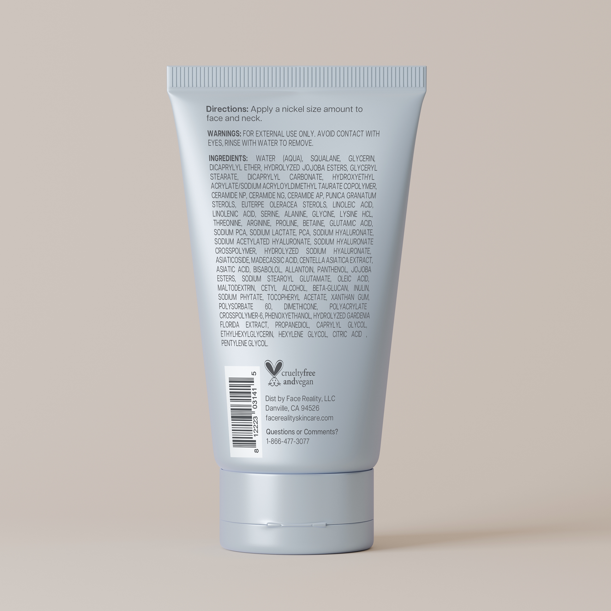 Water (Aqua), Squalane, Glycerin, Dicaprylyl Ether, Hydrolyzed Jojoba Esters, Glyceryl Stearate, Dicaprylyl Carbonate, Hydroxyethyl Acrylate/Sodium Acryloyldimethyl Taurate Copolymer, Ceramide NP, Ceramide NG, Ceramide AP, Punica Granatum Sterols, Euterpe Oleracea Sterols, Linoleic Acid, Linolenic Acid, Serine, Alanine, Glycine, Lysine HCl, Threonine, Arginine, Proline, Betaine, Glutamic Acid, Sodium PCA, Sodium Lactate, PCA, Sodium Hyaluronate, Sodium Acetylated Hyaluronate, Sodium Hyaluronate Crosspolymer, Hydrolyzed Sodium Hyaluronate, Asiaticoside, Madecassic Acid, Centella Asiatica Extract, Asiatic Acid, Bisabolol, Allantoin, Panthenol, Jojoba Esters, Sodium Stearoyl Glutamate, Oleic Acid, Maltodextrin, Cetyl Alcohol, Beta-Glucan, Inulin, Sodium Phytate, Tocopheryl Acetate, Xanthan Gum, Polysorbate 60, Dimethicone, Polyacrylate Crosspolymer-6, Phenoxyethanol, Hydrolyzed Gardenia Florida Extract, Propanediol, Caprylyl Glycol, Ethylhexylglycerin, Hexylene Glycol, Citric Acid , Pentylene Glycol