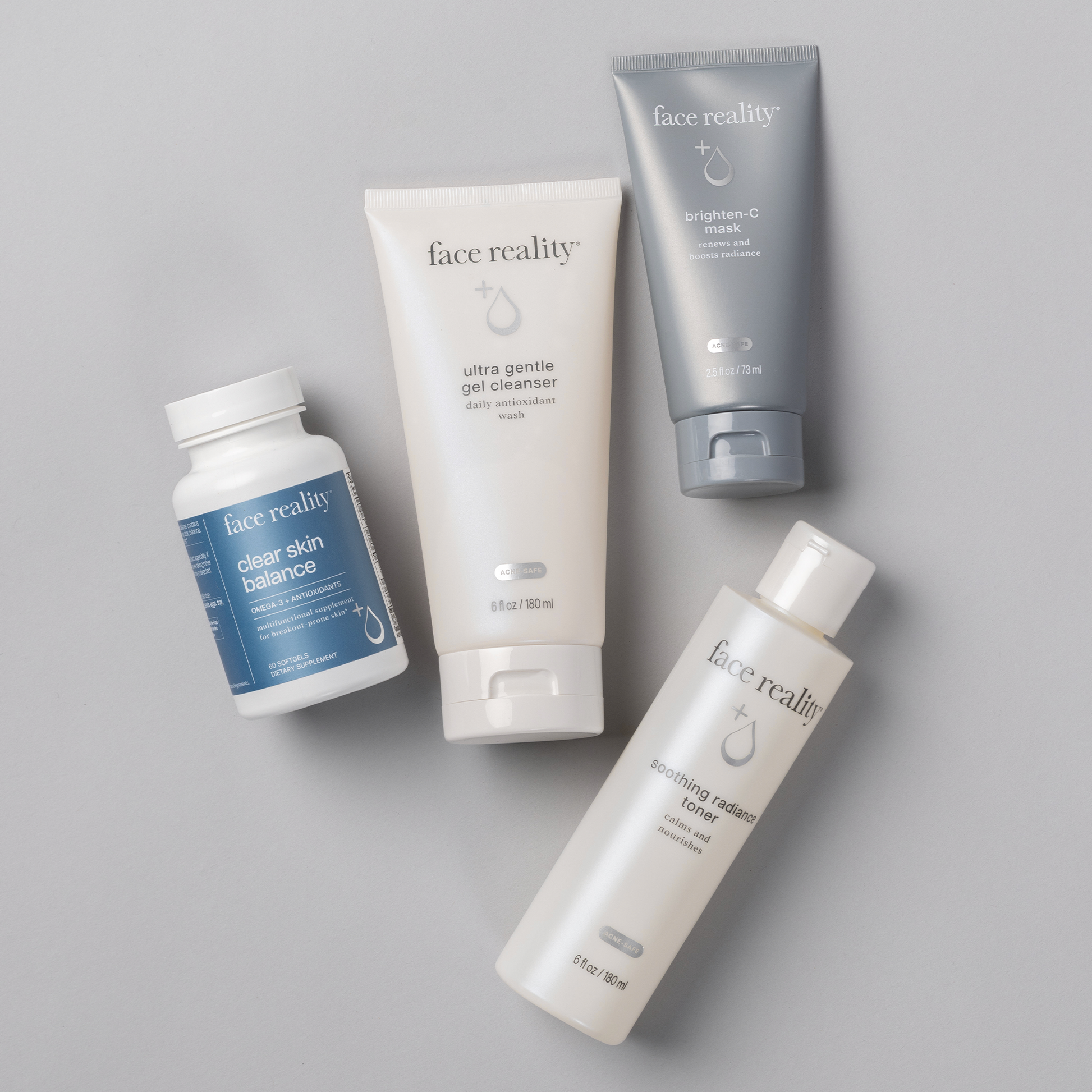 Glow from the ground up with this antioxidant-packed foundation routine. Ultra Gentle Gel Cleanser gently purifies, Soothing Radiance Toner calms and preps, Brighten-C Mask boosts radiance, while supplement Clear Skin Balance delivers omega-3s and Skin Brightening Complex for luminous skin from within.