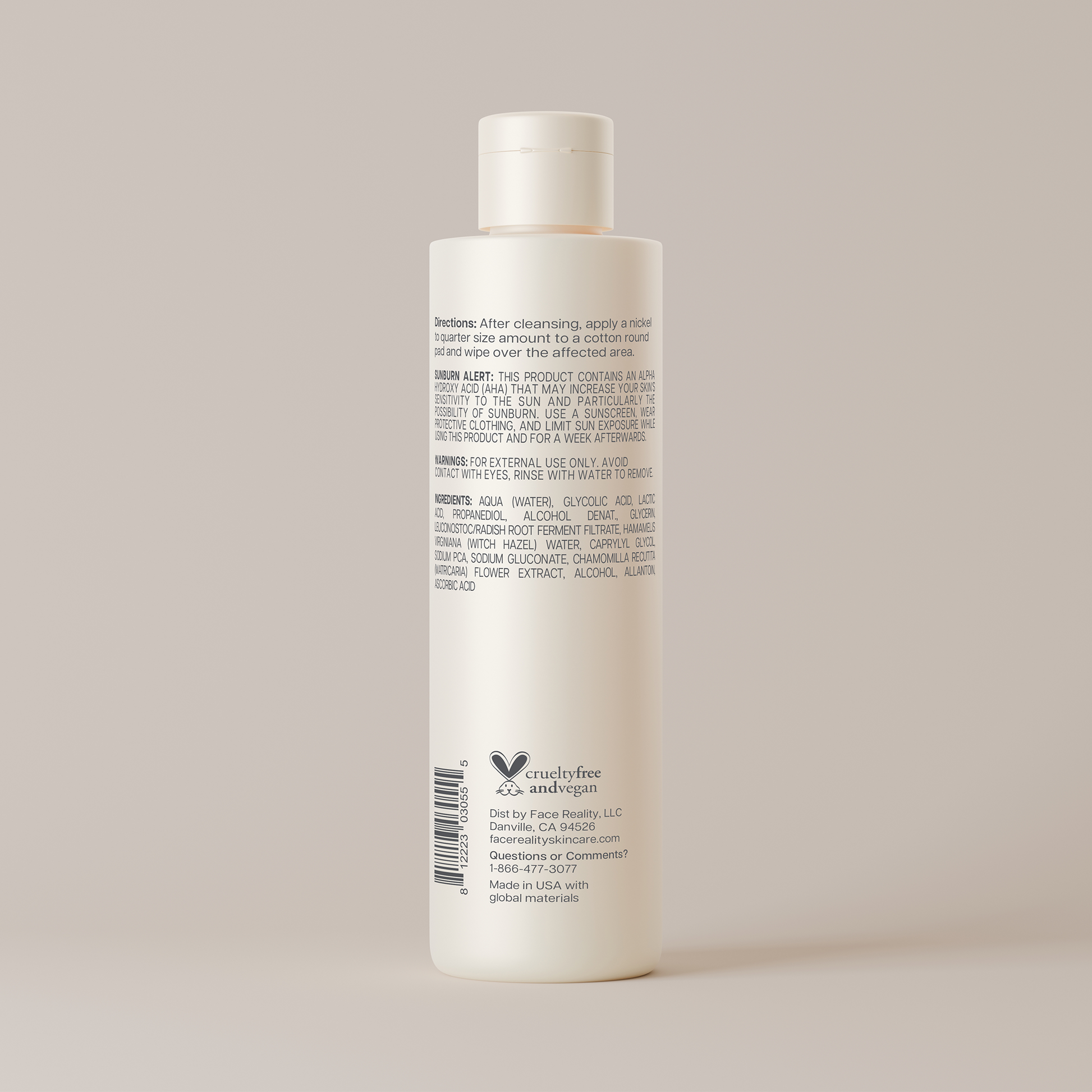 Aqua (Water), Glycolic Acid, Lactic Acid (L), Propanediol, Alcohol Denat., Glycerin, Leuconostoc/Radish Root Ferment Filtrate, Hamamelis Virginiana (Witch Hazel) Water, Caprylyl Glycol, Sodium PCA, Sodium Gluconate, Chamomilla Recutita (Matricaria) Flower Extract, Alcohol, Allantoin, Ascorbic Acid (L)