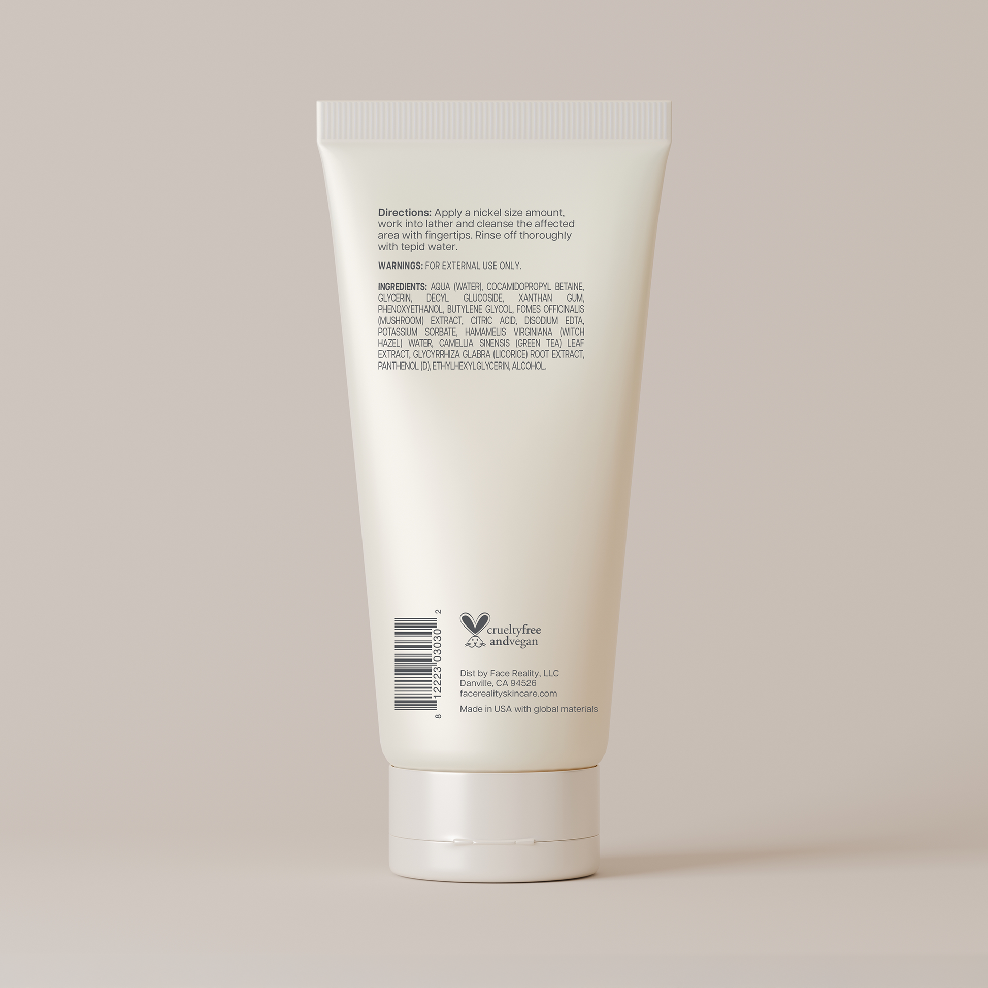 Aqua (Water), Cocamidopropyl Betaine, Glycerin, Decyl Glucoside, Xanthan Gum, Phenoxyethanol, Butylene Glycol, Fomes Officinalis (Mushroom) Extract, Citric Acid, Disodium EDTA, Potassium Sorbate, Hamamelis Virginiana (Witch Hazel) Water, Camellia Sinensis (Green Tea) Leaf Extract, Glycyrrhiza Glabra (Licorice) Root Extract, Panthenol (D), Ethylhexylglycerin, Alcohol